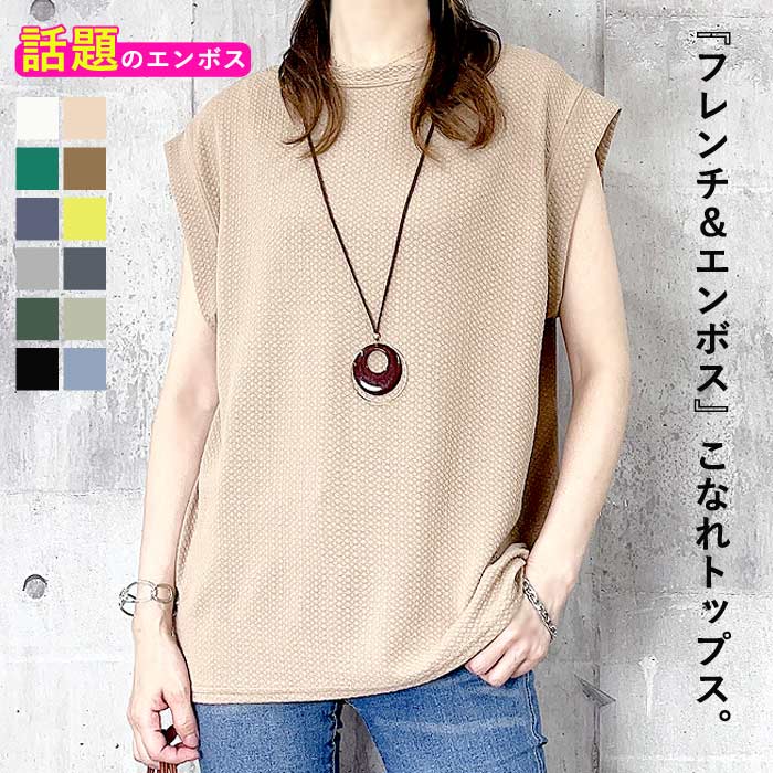 フレンチスリーブ エンボス加工 ノースリーブ トップス こなれ Tシャツ (送料無料) [郵2] ^t1004^