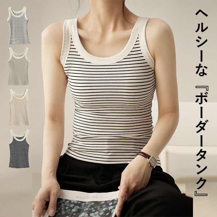 タンクトップ レディース トップス ノースリーブ リブ 綿混 コットン混 春 夏 黒 白 タイト インナー 重ね着 レイヤード ボーダー シンプル[郵1.5]^t1103^