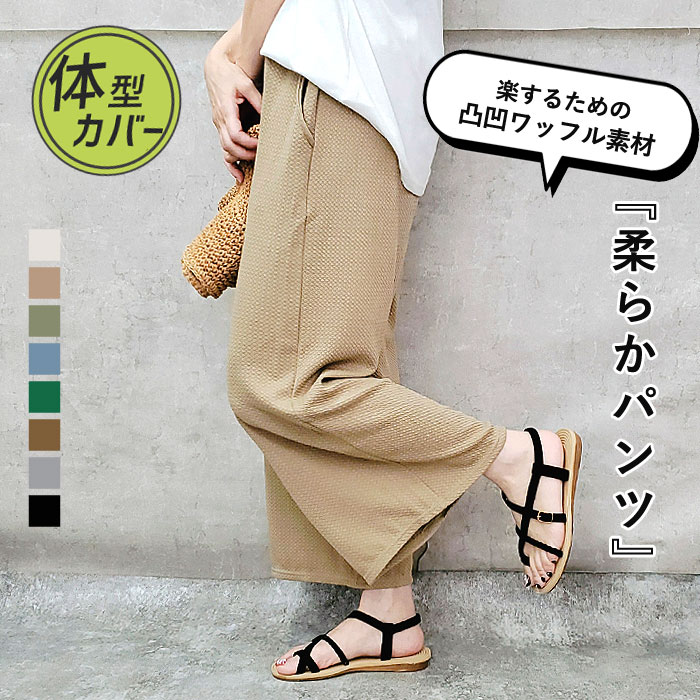 ガウチョパンツ レディース ボトムス ワイドパンツ 凸凹 楽ちん ポケット付き エンボス加工 ロゴ紐 夏送料無料 [郵2]^b449^