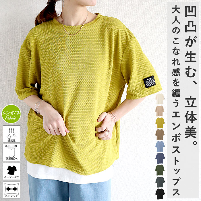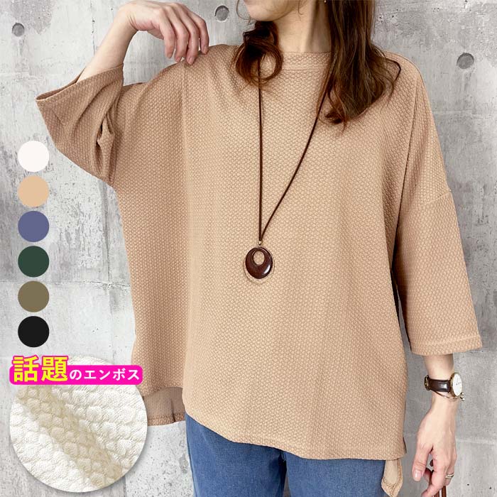 トップス エンボス加工 レディース 七分丈 五分丈 Tシャツ カジュアル ドロップショルダー 体型カバー (送料無料)[郵3]^t995^