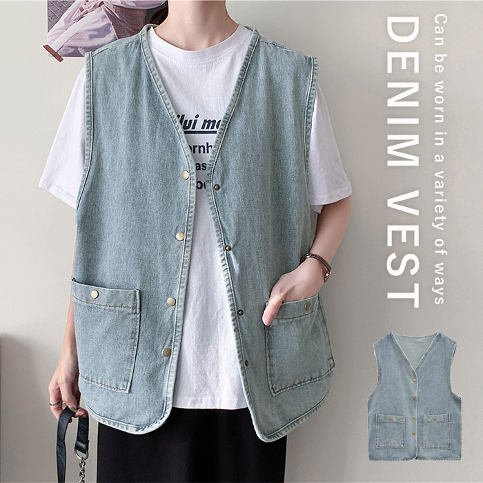 ベスト レディース デニムベスト トップス 春 夏 おしゃれ 重ね着 レイヤード カジュアル シンプル ポケット付 [郵3]^v188^