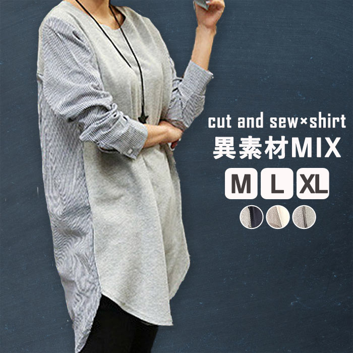 シャツ カットソー 長袖 tシャツ レディース トップス 秋 冬 韓国 おしゃれ 薄手 異素材MIX 切り替え ストライプ ^t772^ [郵2]