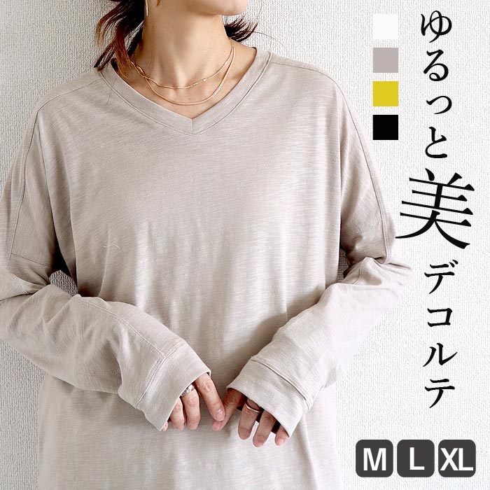 Vネック ロンt チュニック 長袖 カットソー ドルマンスリーブ ゆる トップス レディース Tシャツ素材 オーバーサイズ ビッグシルエット^t054^ [郵2]
