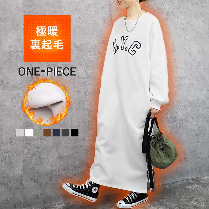 ワンピース ワンピ レディース 裏起毛 秋 冬 黒 白 おしゃれ スウェット 長袖 無地 ロゴ マキシ丈 体形カバー (送料無料)^w471^