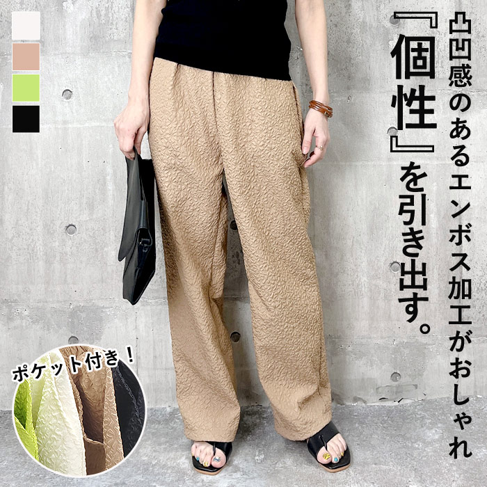 ジャガードパンツ レディース パンツ ボトムス エンボス加工 ポケット付き 楽パンツ きれいめ 二次会 結婚式 パーティ ウエストゴム 春 夏 (送料無料)[郵3]^b391^