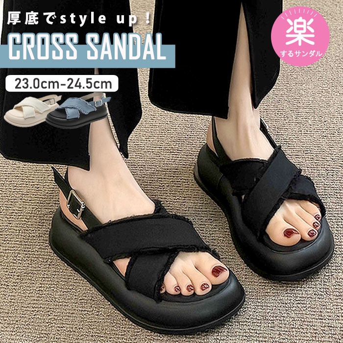 サンダル レディース 厚底サンダル デニム 厚底 クロス 歩きやすい 疲れにくい おしゃれ 美脚 トレンド 楽ちん キレイめ 夏 ビーチ 安定感 痛くない 旅行 黒 白(送料無料)^bo-939^