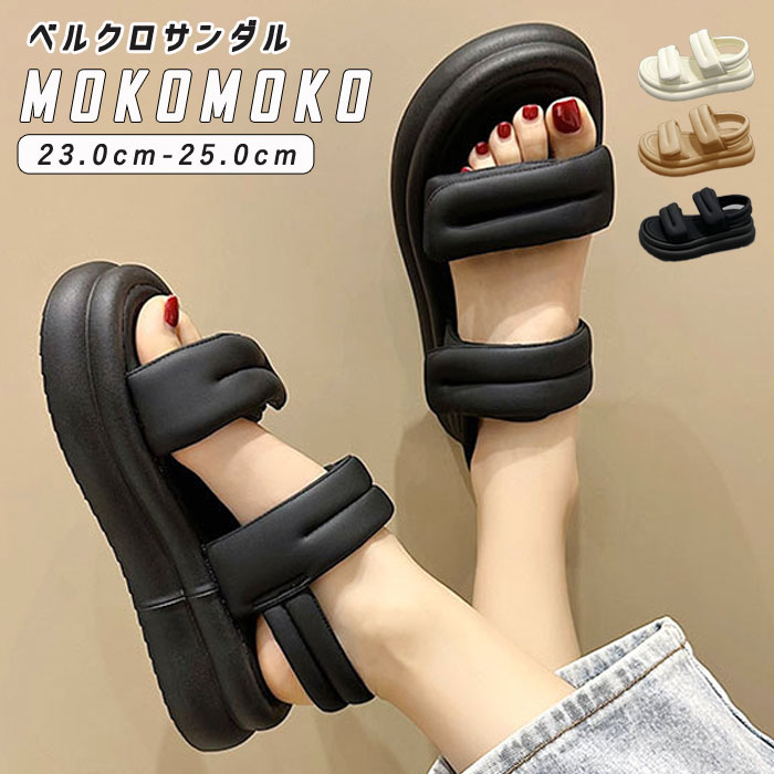 サンダル レディース 厚底 厚底サンダル ベルトサンダル オープントゥ フラット 白 黒 美脚 痛くない 楽ちん 歩きやすい マジックテープ 韓国 ふわふわ 安定(送料無料)^bo-941^